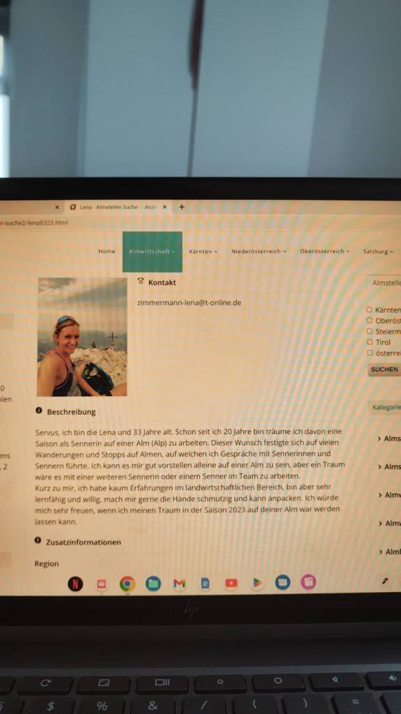 Bei alm.at konnte ich mich entscheiden, mich direkt auf Inserate zu melden oder selbst einen Steckbrief mit Kontaktdaten zu entwerfen.