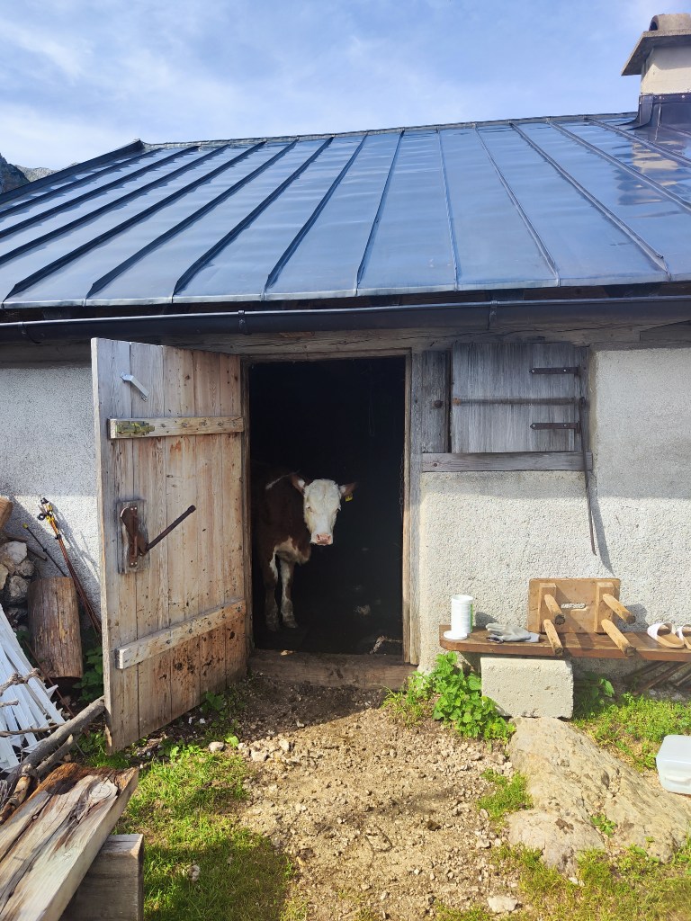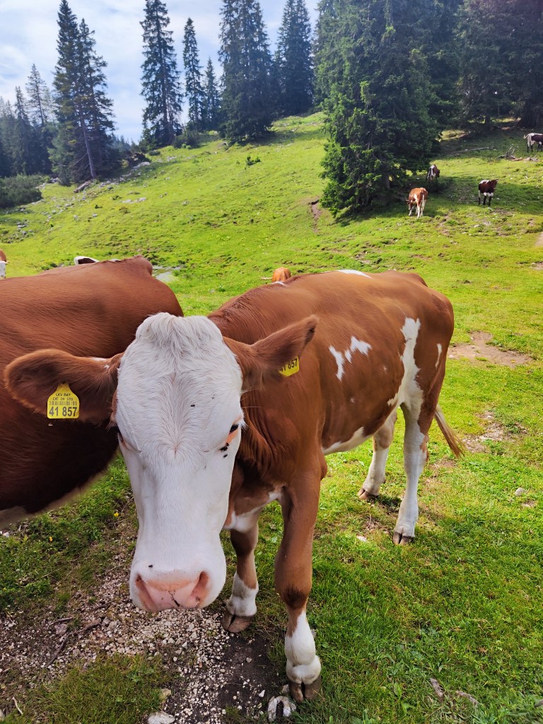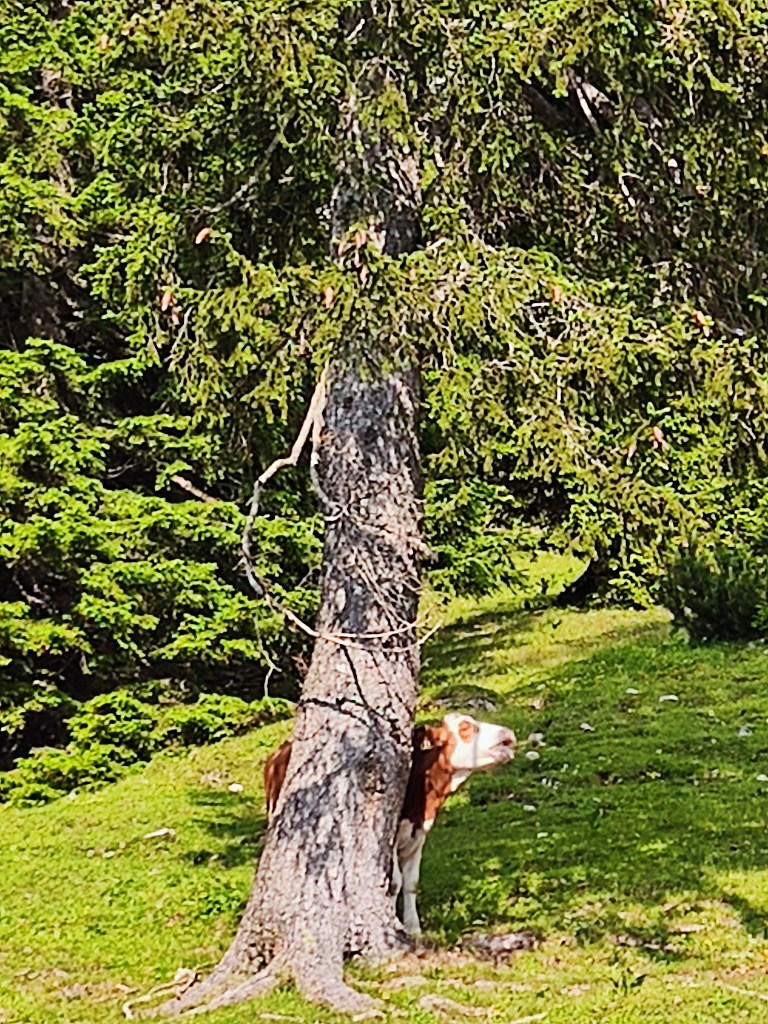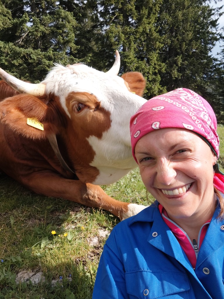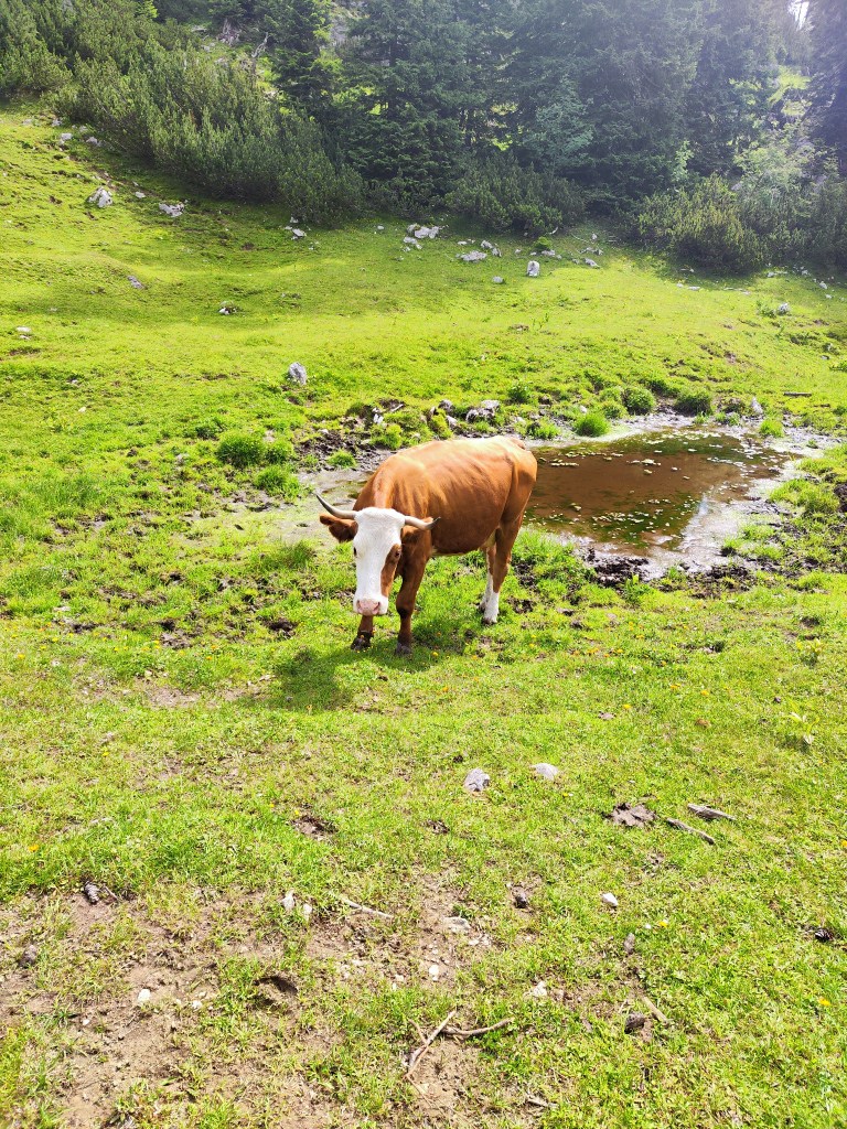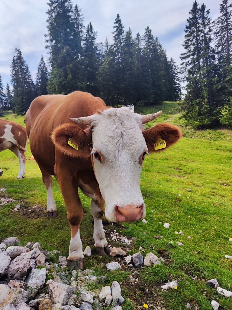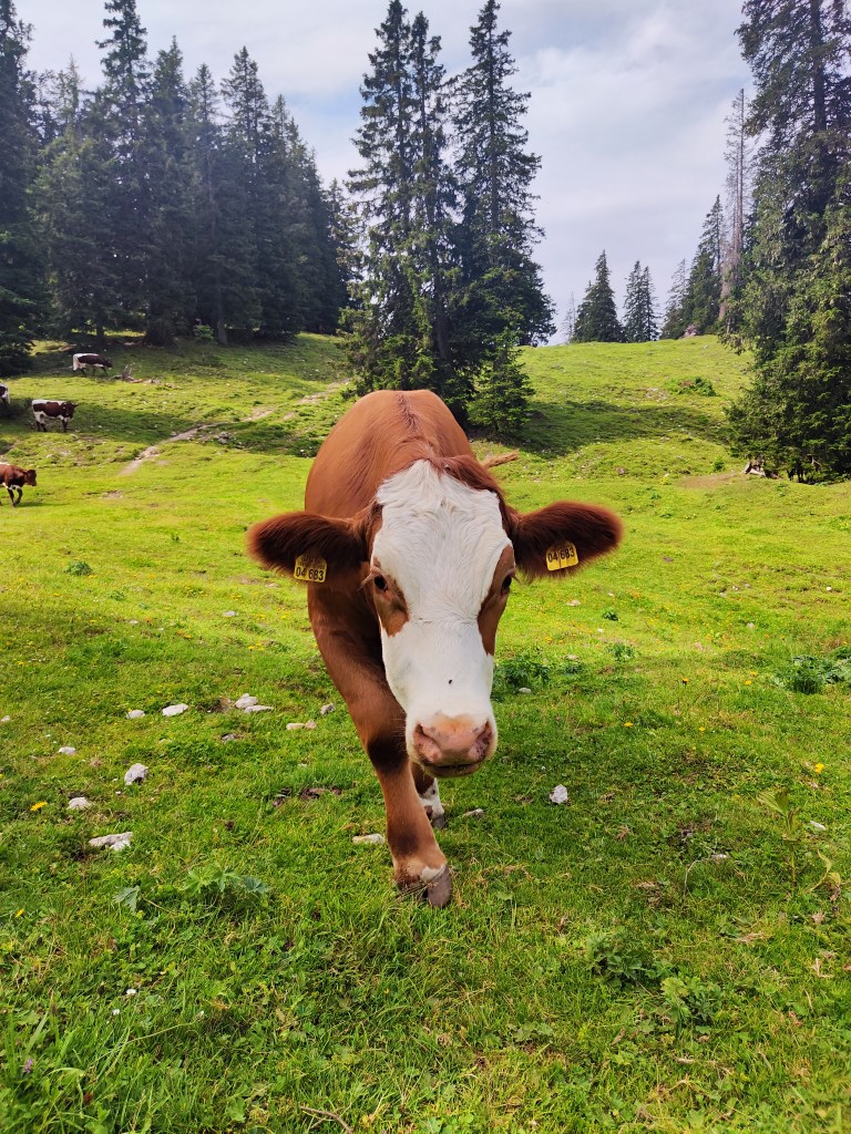 Almrausch- Glockenkuh sie ist sehr stolz auf ihre Glocke, welche auf der gesamten Alm die lauteste und am blechig klingenste ist. Wenn man ihren Namen ruft, schaut sie einen auch aus weiter Entfernung sofort an. Wenn ich ihren Namen rufe, geht sie nach dem Herschauen meist direkt in die andere Richtung.
