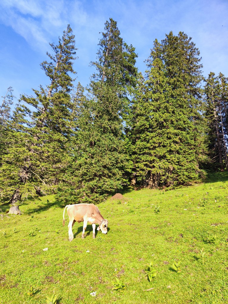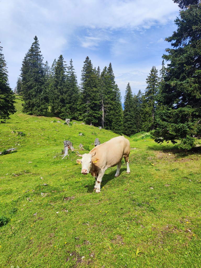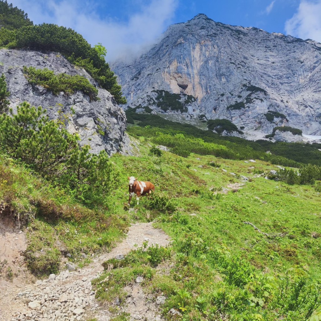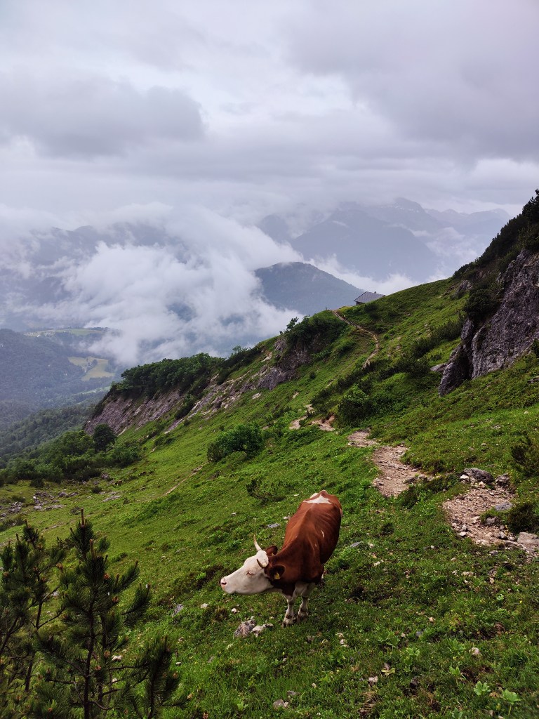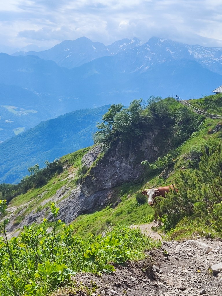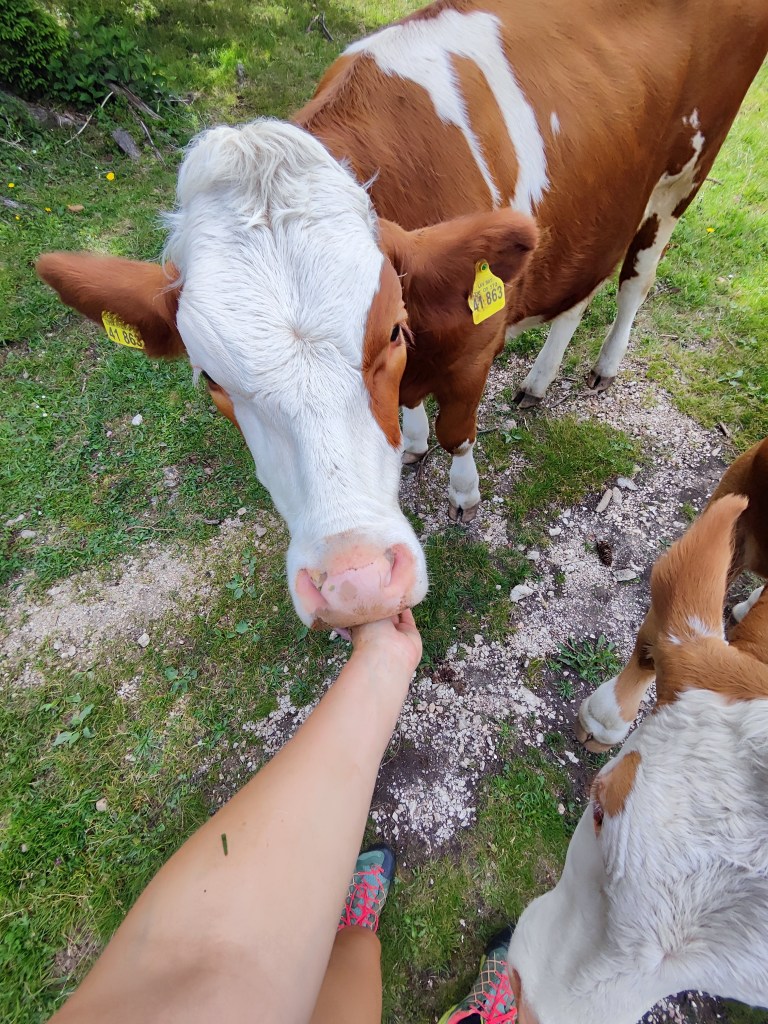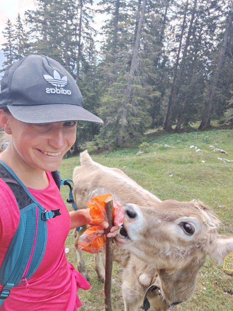 Almrausch- Glockenkuh sie ist sehr stolz auf ihre Glocke, welche auf der gesamten Alm die lauteste und am blechig klingenste ist. Wenn man ihren Namen ruft, schaut sie einen auch aus weiter Entfernung sofort an. Wenn ich ihren Namen rufe, geht sie nach dem Herschauen meist direkt in die andere Richtung.