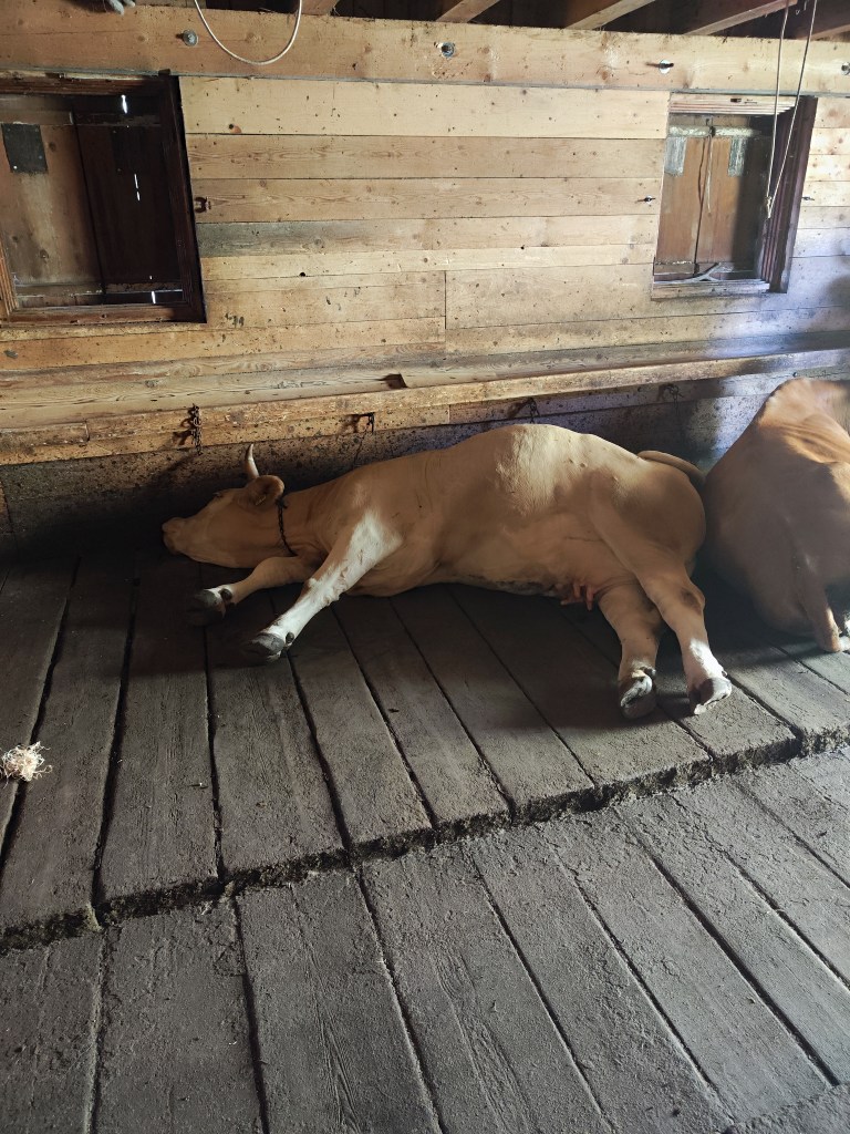 Siberl- die Schwerfällige ist sehr hell und schwer, dennoch war sie auf der Scheim immer eine der Kühe die am höchsten gestiegen ist, worauf sie das obe gehen nicht mehr gefreut hat. Sie liebt es sich in der Kiahhütten tot zu stellen, träumt sehr laut und hört sich dabei wie eine dumpfe, schwere Tür an, welche Mal wieder geölt werden sollte.